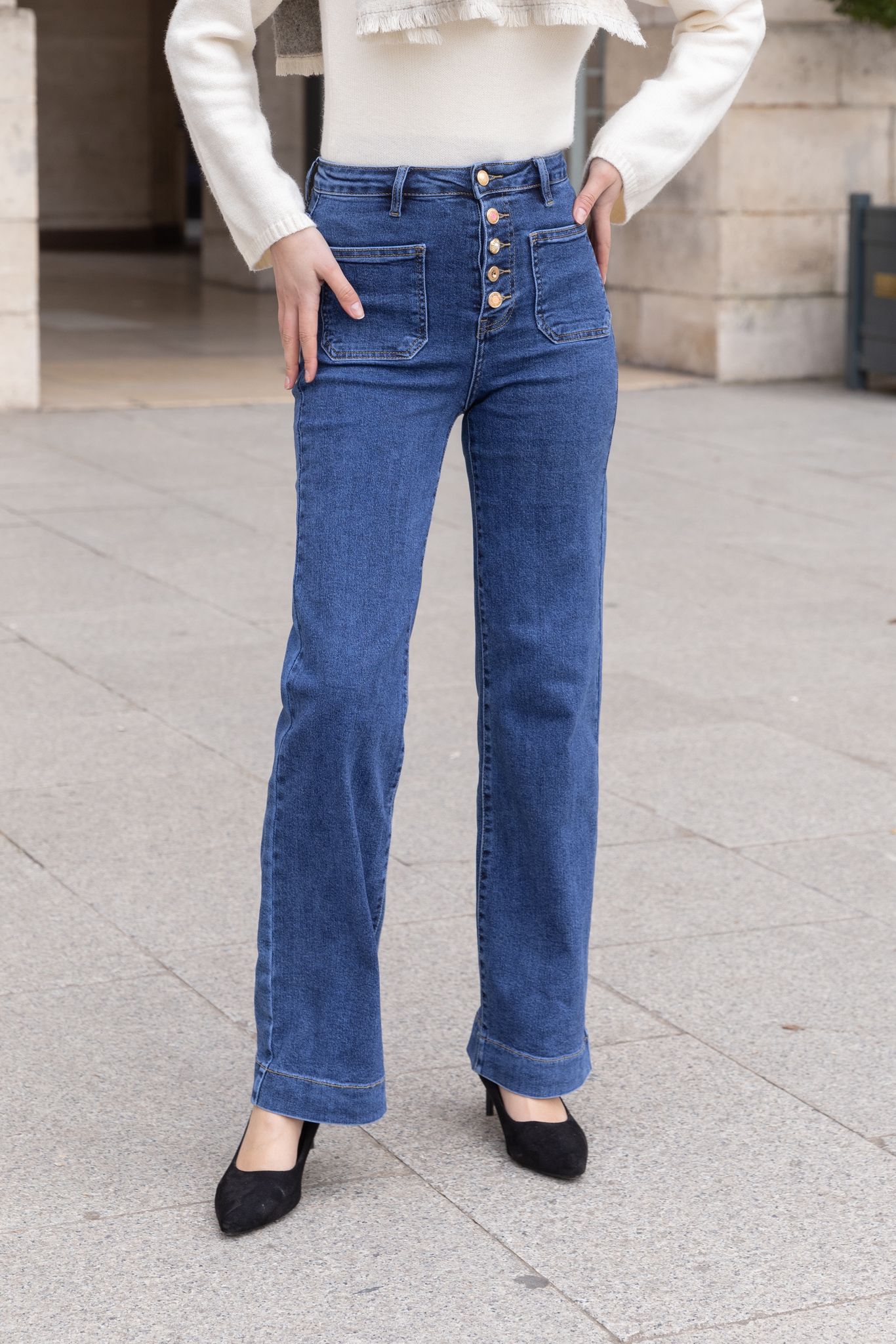 Dark Blue Stretchy front button with pocket detail wide leg jeans (6-14)