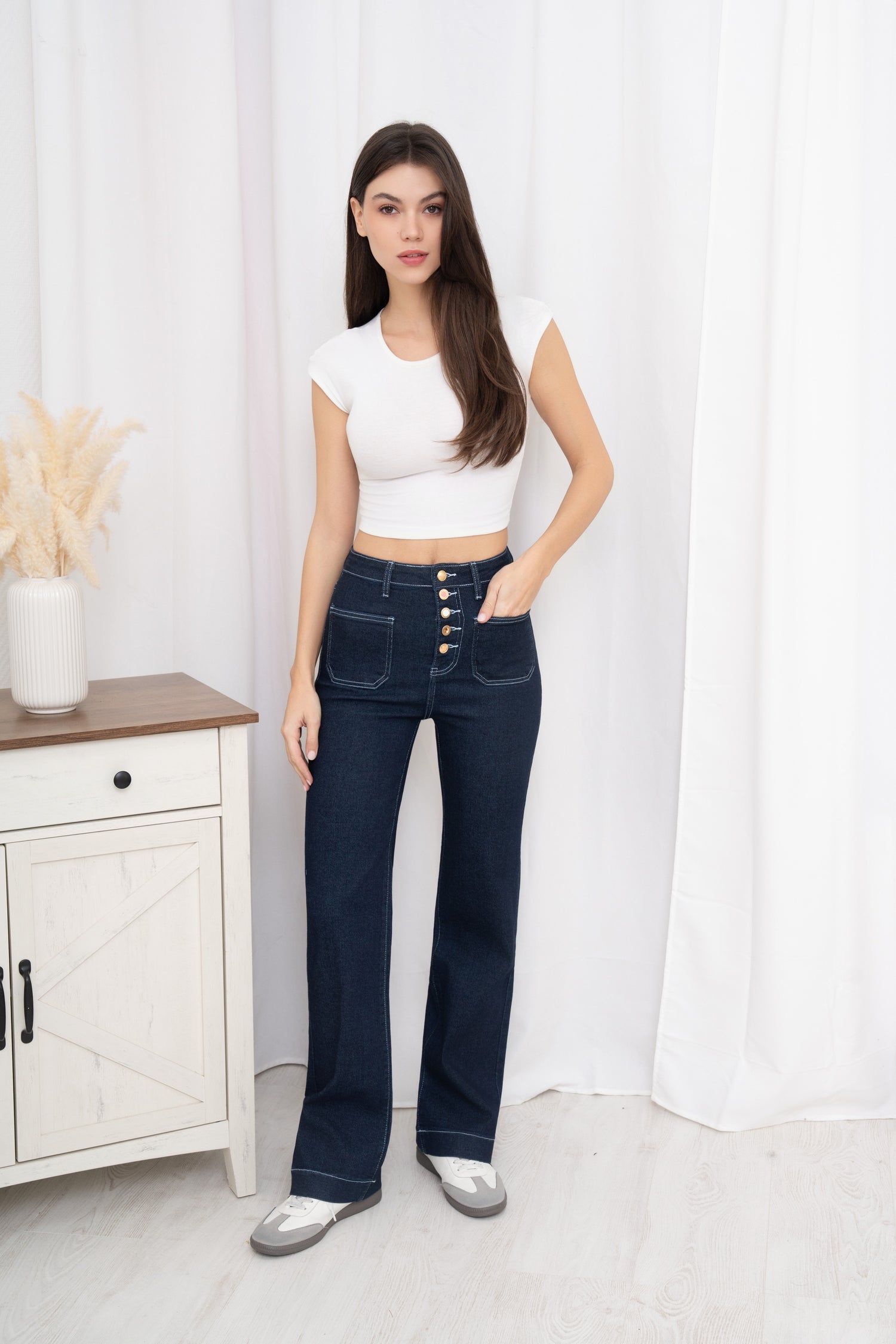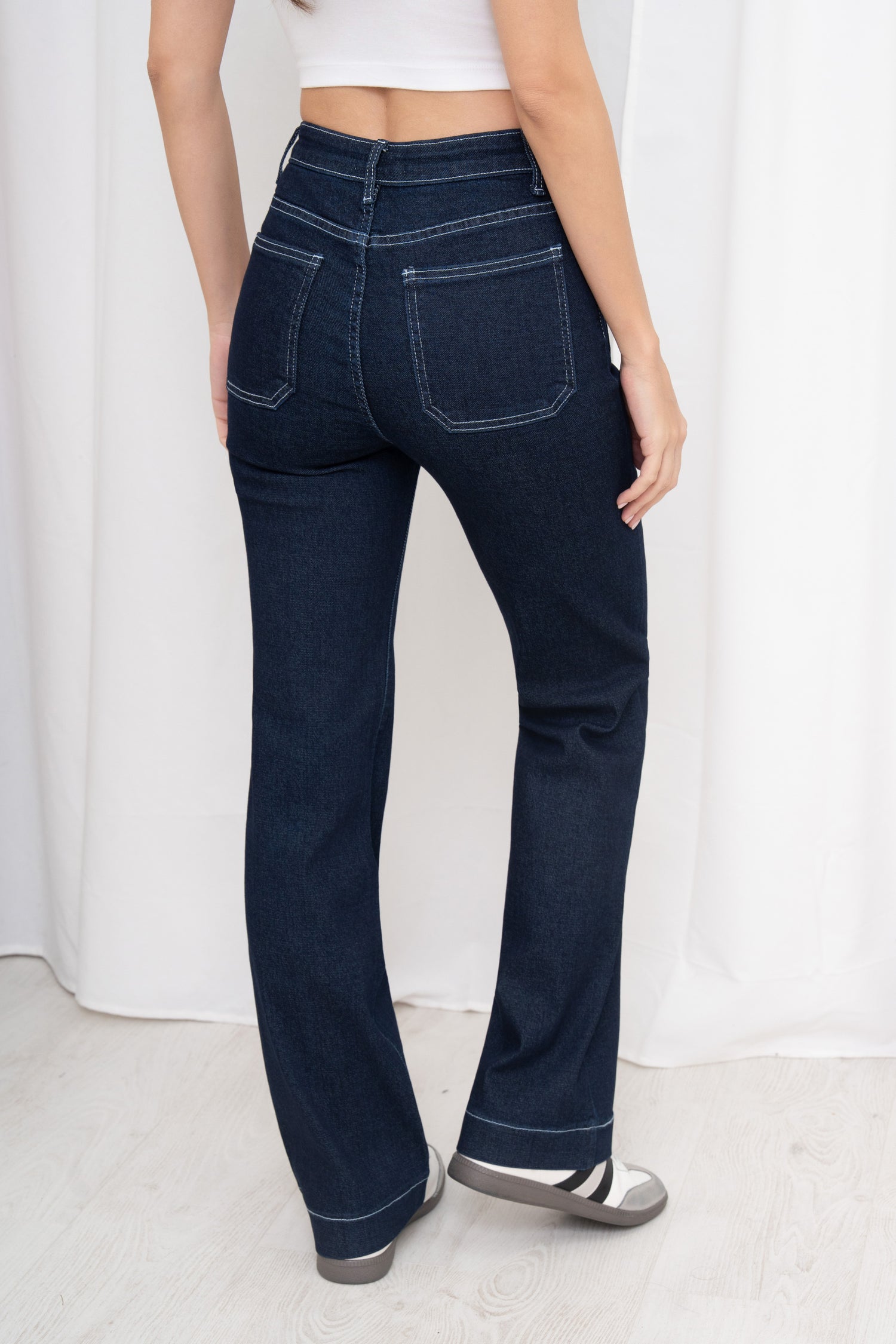 Front Pocket Full Button Detail Dark Denim Blue Jeans