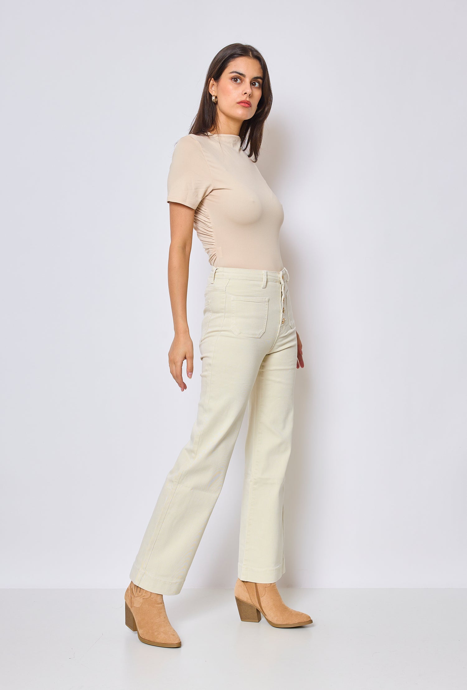 Front Pocket Full Button Detail Denim Beige Jeans